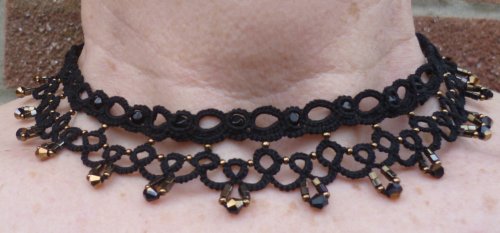 I love necklaces, well in fact all jewelry, but very aware that tatting needs to be quite firm if it is to be worn around the neck, otherwise it tends to curl. With this design I put beads in the first row and then added some chains which naturally makes the tatting curve but perhaps more importantly gives it that firmness which is very necessary. I suspect someone else has probably done something similar so really can't claim it as my own, nevertheless I wanted to share it with you.